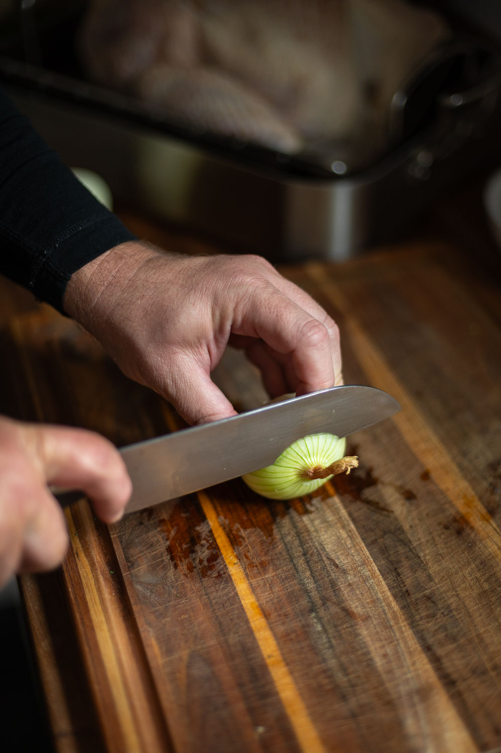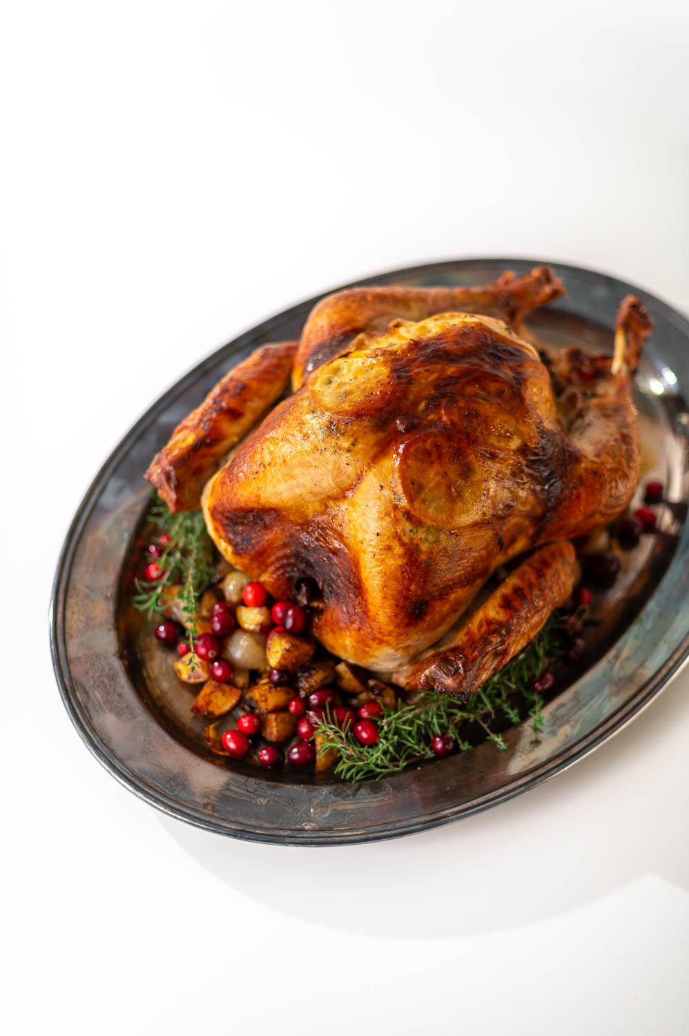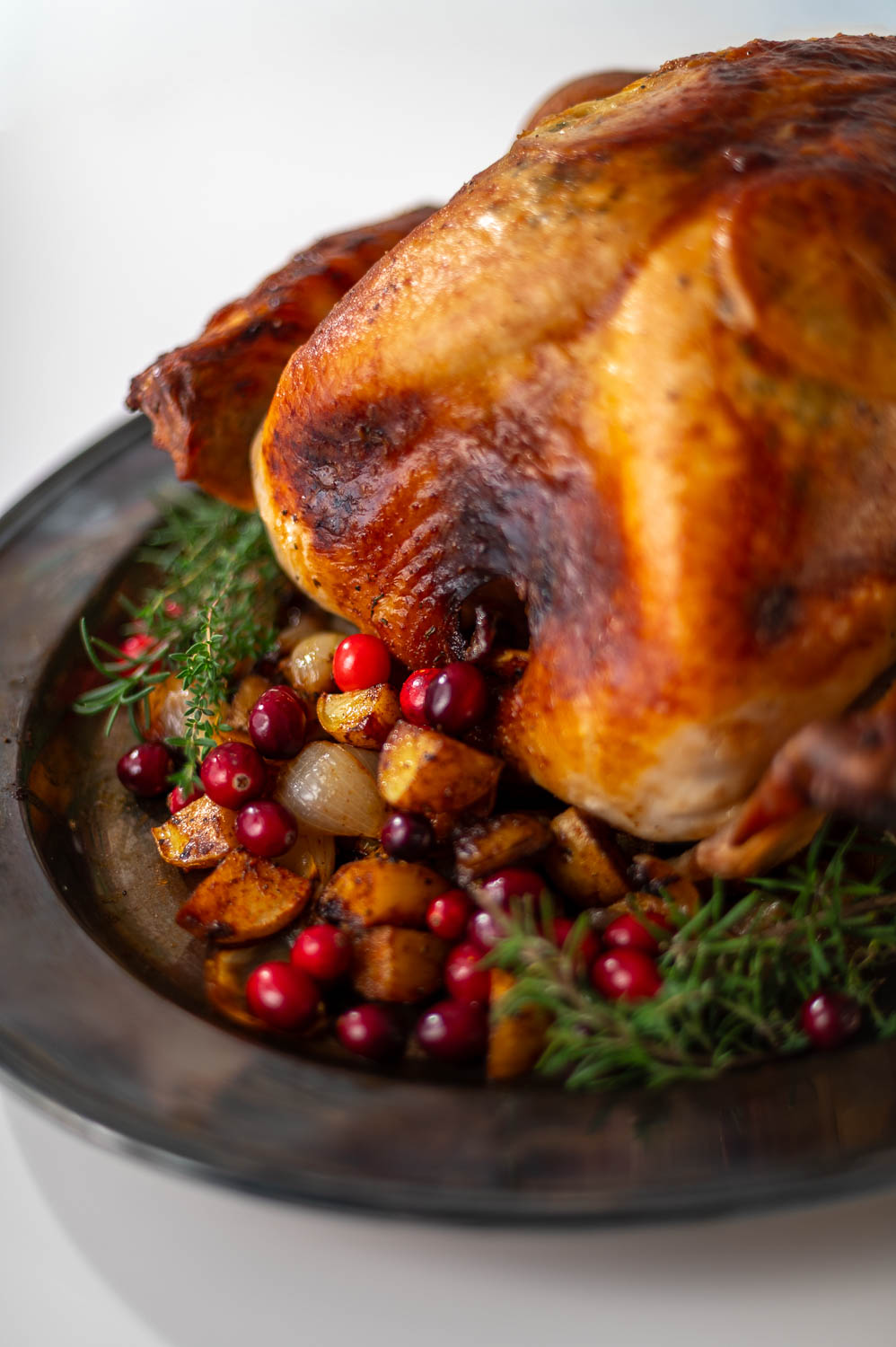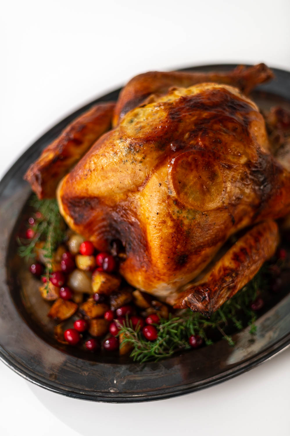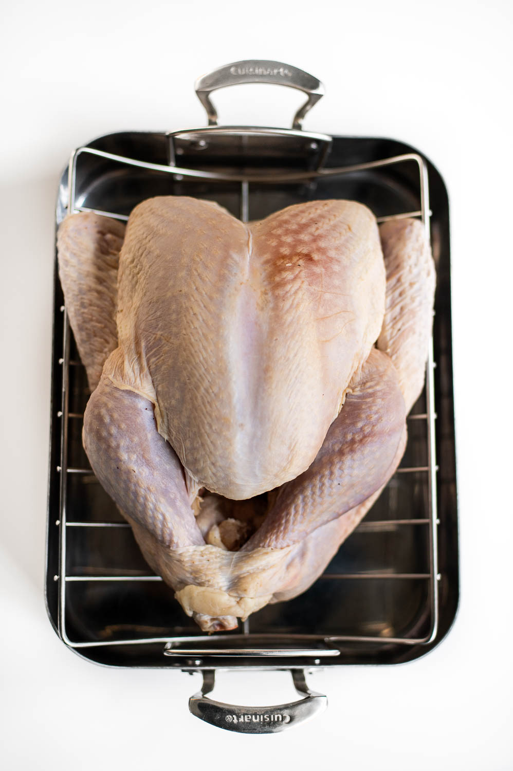 Joe did A LOT of research before investing in this roasting pan and it has definitely lived up to the hype. It’s an investment for sure, but the quality is top notch. That said you don’t need a fancy roasting pan to cook a great turkey. A disposable aluminum pan will work just as well! Just be sure and set some potatoes or onions under the turkey so the turkey isn’t sitting directly on the bottom of the pan.