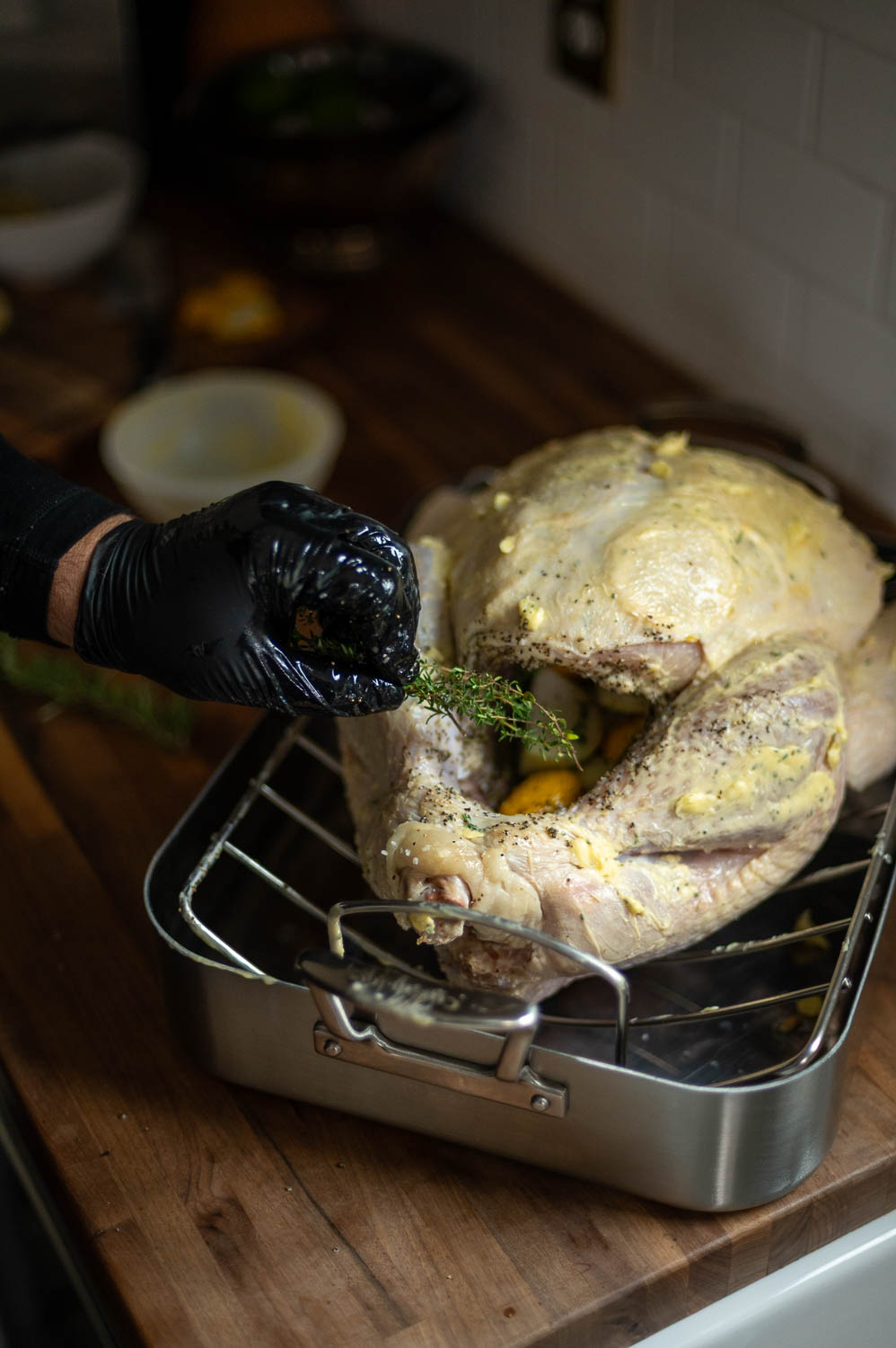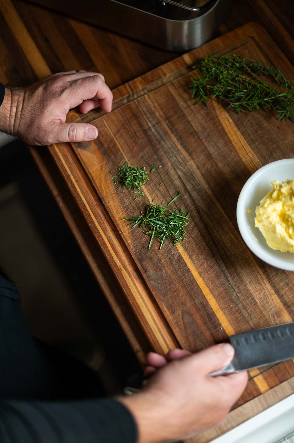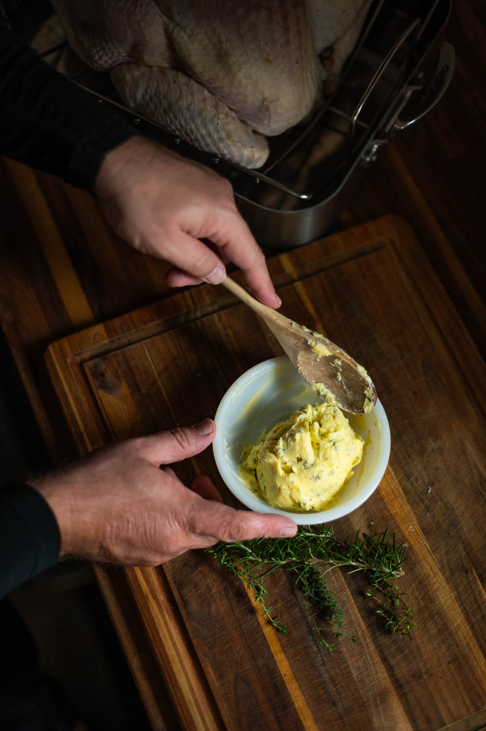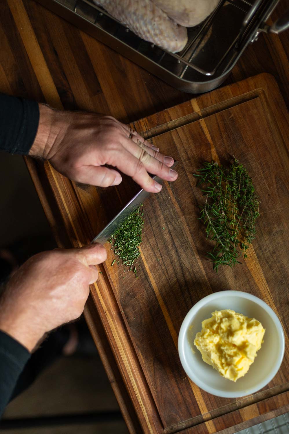 Detach the leaves from half your rosemary and thyme stems and finely mince them. (We’ll use the rest of the herbs inside the turkey later).