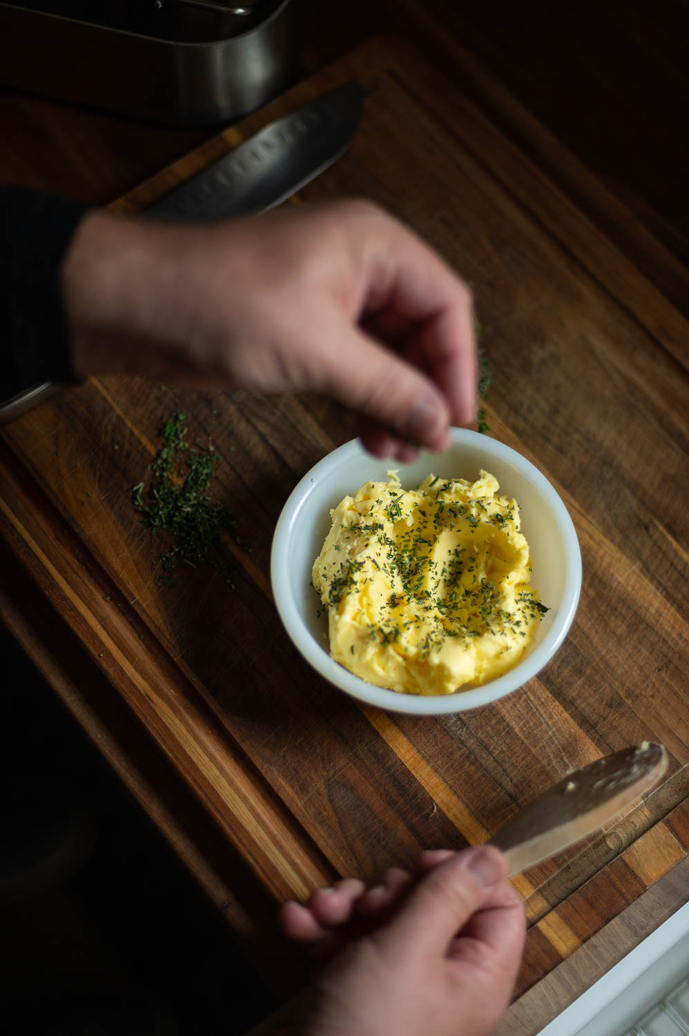While the oven is preheating, place your softened butter in a small bowl and gather your herbs.