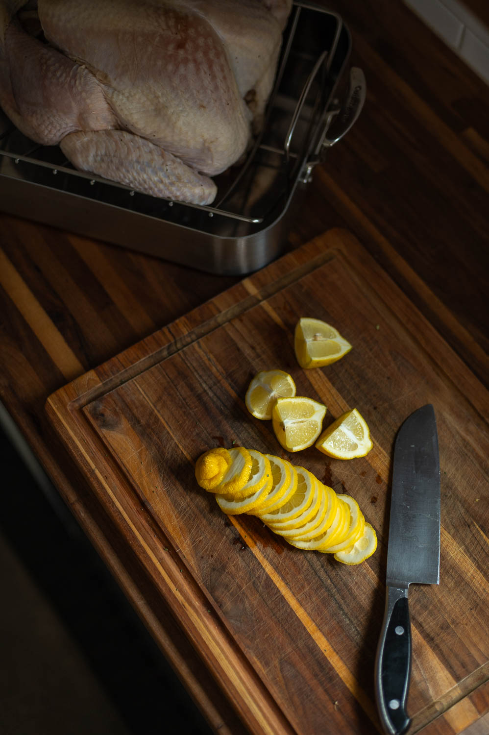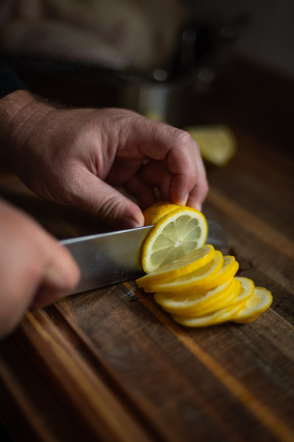 Now thinly slice one of your lemons, then quarter the other.