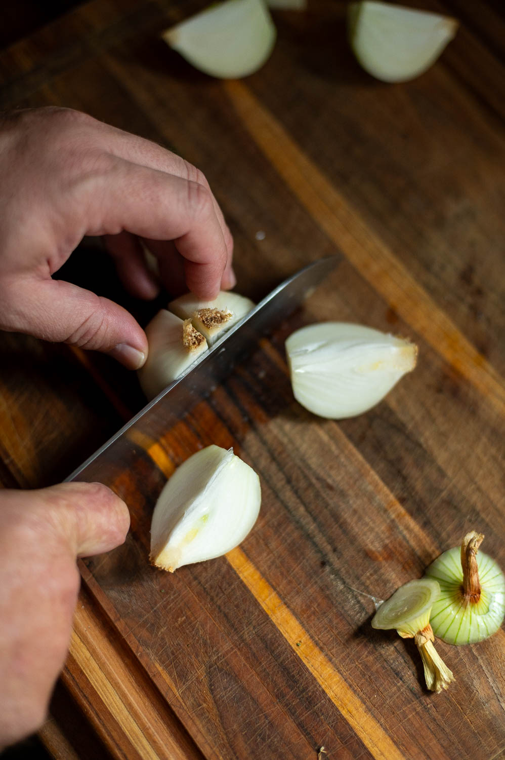 Next grab two onions and quarter both of them. (You can also just cut one large onion into 8 sections and that works fine too, you just want the chucks to be about the same size as your lemon quarters)