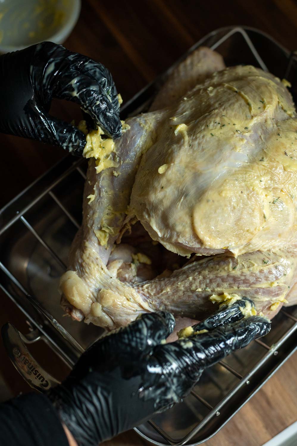 Next rub the remaining herb butter all over the top and side of your turkey. (Yes this is a lot of butter…)