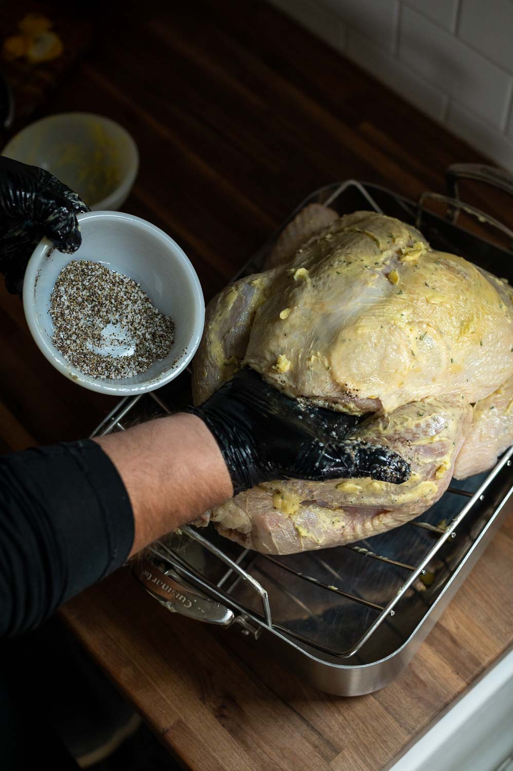Combine the salt and pepper together and liberally coat every surface of the cavity of the turkey with the salt and pepper mixture.