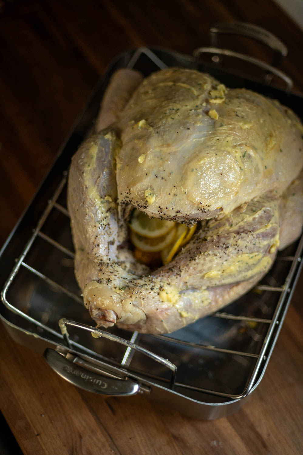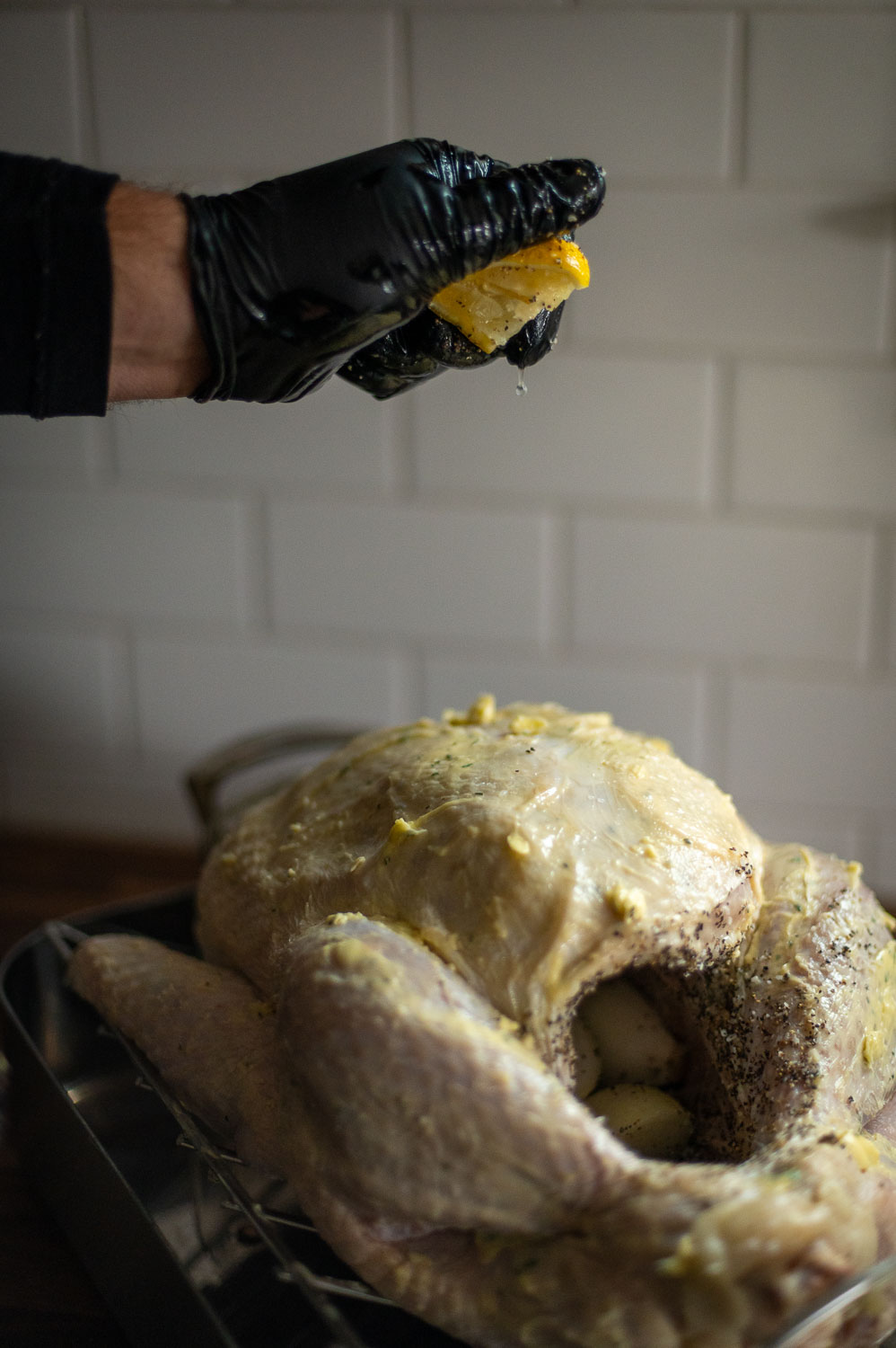 Squeeze a little bit of lemon juice out of each lemon quarter onto the top of your turkey then place all the lemon quarters inside the cavity.