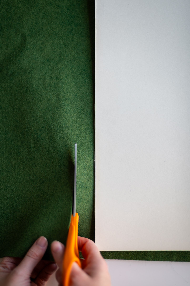 Use fabric scissors or a rotary cutter to trim down your fabric, leaving at least 1-2 inches of excess all the way around the board.