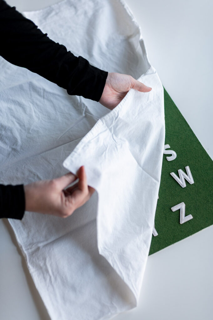 Pro Tip: You’ll need to place a protective barrier between your applique letters and the iron, you can use a linen pressing cloth for this like shown above, or a plain sheet of parchment paper.