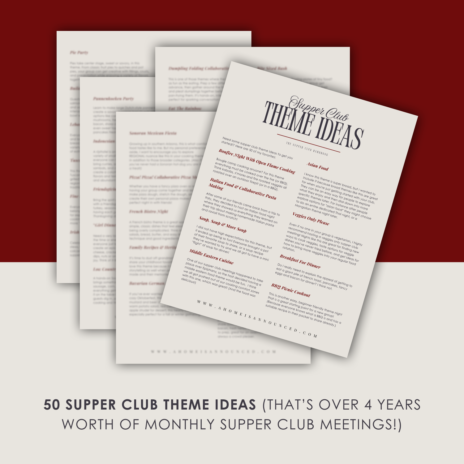 Creative, ready-to-use supper club theme ideas and menu inspiration. That’s over four years of monthly dinner gatherings planned for you.
